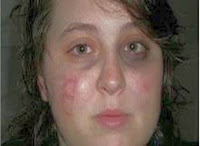 Gee, I wonder what gave it away? The half-assed makeup job on her eye? Or perhaps the backward “B” carved on her cheek with what appears to be a very dull blade?